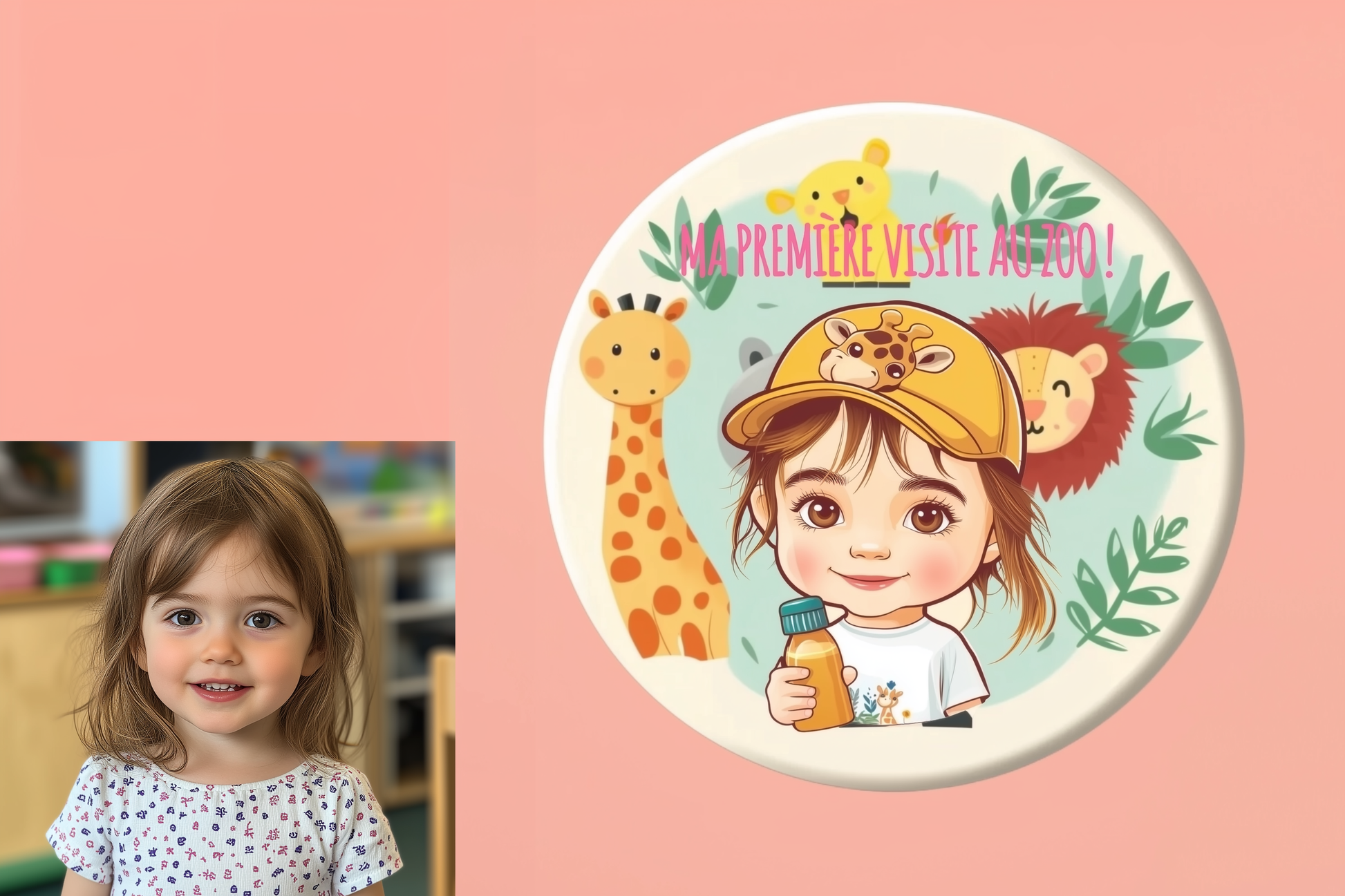 Transformez une photo de sortie au zoo en badge cartoon rempli de tendresse et de curiosité.